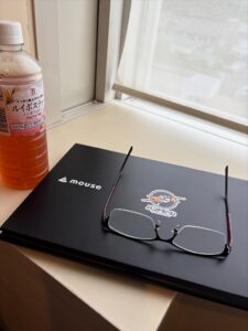 この光景を眺めながら、こうしてまたこの地を訪れることができた不思議なご縁に、静かに感謝の気持ちが湧き上がってきます。デスクの上にはPCと眼鏡、そして旅の相棒のお茶。非日常の中にある、いつもの風景が心を落ち着かせてくれました。