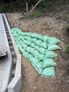 まず心を鷲掴みにされたのが、着々とその姿を変えている裏山の整地工事現場です。先日、美しい積み石が並べられたと思ったら、今度はその隣に、鮮やかな緑色の謎の物体がびっしりと出現したのです!