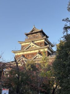 広島城です。 実は私、広島県民でありながら、しっかりと広島城を訪れたのは今回が初めてでした。 薄い夕陽を浴びて輝く天守閣。 その姿は、想像していた以上に凛々しく、力強く、そして美しいものでした。