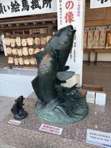 見てください、この見事な「鯉」の像。 さすが広島、「カープ(鯉)」の街です。 神社の至る所に鯉が祀られているのを見ると、「あぁ、広島に帰ってきたんだな」という実感が湧くと同時に、この街のブレない地元愛に思わずニヤリとしてしまいます。