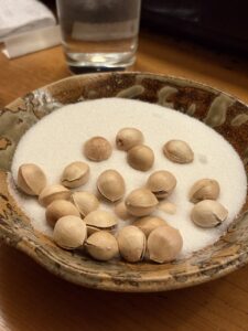 焼き銀杏です。 このシンプルな姿がたまりません。 ただし、敷き詰められた塩は熱々ですので、火傷には要注意(笑)。