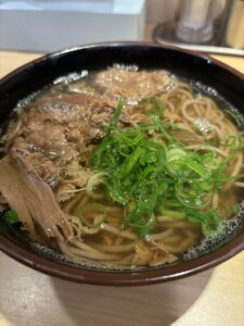 「暖簾の奥に吸い込まれる」とは、まさにこのことでしょう。 ちょうどカウンターが空いているのが見えた瞬間、気づけば私は食券販売機の前に立ち、目は既にメニューを追っていました(笑)。 いただいたのは、出汁の効いたお蕎麦。 シンプルですが、体に染み渡る旨さ。 これぞ旅の醍醐味、明日へのエネルギーチャージです。