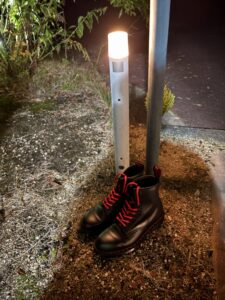 暗闇の中でライトに照らされ、鈍く光る黒いレザーと赤い靴紐。 「Dr. Martens(ドクターマーチン)」のブーツです。