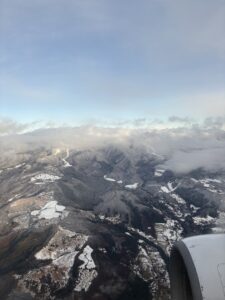 眼下の山々が白く染まっています。 山形県上空、到着寸前です! この景色を見る限り、地上は相当冷え込んでいることでしょう。 降りた瞬間の寒さを想像して身震い……なんてしませんよ。 なぜなら、私の心は未知の土地への期待で燃えているからです!