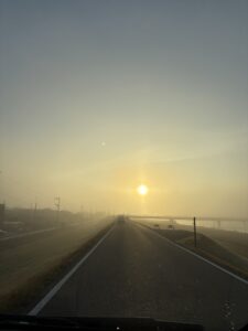 ハンドルを握ると、目の前には白い朝もや。 朝陽が差し込み、なんとも幻想的な光景です。 まるで映画のワンシーンの中にいるようで、ついロマンチックな気分に……なりかけますが、そこはやはり経営者(笑)。 「視界が悪いな、事故のリスクがあるな」 と、頭の中では極めて現実的なリスク管理の計算が働いてしまいます。 霧の中でアクセルを踏む怖さは、先の見えない経営の舵取りにも似ているかもしれません。