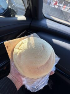 見てください、このサイズ! 手のひらよりも遥かに大きい、巨大メロンパンです。 大人になっても、こうした「えっ!」という分かりやすい驚きは楽しいものです。 口を極限まで大きく開けて挑むのですが、どこから齧っても同じ形なので、気づけば手の中でメロンパンがくるりと一周していました(笑)。