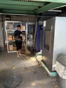 空の方から降ってきたその声の主は、実習生の彼でした。 彼の方を見ると、黙々と作業をしています。散らばった落ち葉を丁寧に掃き集めていたのです。