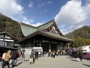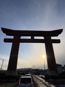 車の中から見上げる大鳥居。 毎年この下をくぐる瞬間、緩んでいた気持ちがグッと引き締まります。 「今年もやるぞ」というスイッチが入る、私にとっての結界のような場所です。