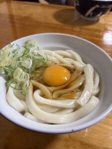 お腹も空いたところで、名物の「伊勢うどん」をいただきました。初の伊勢うどんは黄身付きをオーダー。