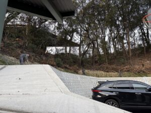 実は、この裏山の擁壁工事を行う際、最も気を使って設計していただいたのが「水の動線」です。 大雨が降った時、山からの水や雨水をいかにスムーズに、コントロールされた状態で河川へと流すか。 流量を予測し、細部にわたって水を流す仕組みを張り巡らせてあります。 どんなに頑丈な要塞も、水の逃げ場がなくなれば脆(もろ)いものです。