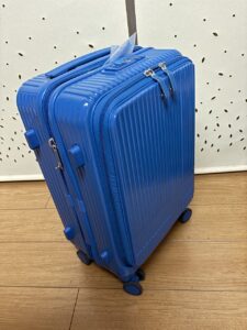 鮮やかなブルーが目を引く、このキャリーケースです。