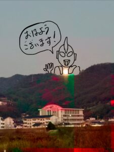 美しい「朝月」が出ていました。 本来なら「風流ですね」と書くべきところですが、私の中の素直じゃない「もう一人の私」が出てきてしまいました。 山の端にかかる丸い光が、どうしても**「カラータイマー」**に見えてしまったのです。 気づけば写真にペンを走らせ、某・光の巨人を描いていました。 「おはようございます!」じゃないですよね(笑)。