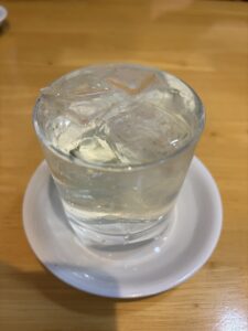 グラスになみなみと注がれたこちら、ただの水ではありませんよ。 「ステラ」という、トウモロコシから作られた大変美味しい焼酎のロックです。
