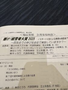 現場で情熱を燃やした後は、場所を移して「学び」の時間へ。 本日は中小企業家同友会、福山支部の3月例会に参加してきた。4人の経営者が、自社の取り組みを25分という限られた時間の中で、文字通り「全身全霊」で語る姿に、深い感銘を受けた。