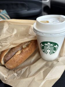 休日出勤を終え、昼食はスターバックスでテイクアウト。 以前、助手席にコーヒーをこぼすという悲劇に見舞われた苦い経験がある。今日はその教訓を活かし、そのまま車中でいただくことに。