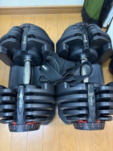 私のリフレッシュタイムに欠かせない、この重量可変式ダンベル。少々図体はデカいが、これほど頼もしいパートナーはいない。