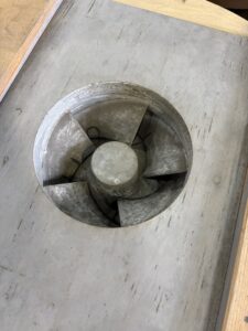 鋳物の世界に生きる私たちがこれを見れば、即座に「あぁ、インペラの芯取り(しんとり)だね」と合図を送り合う。 丸い開口部から覗く数枚の羽根。その独特な形状から、直感的に「一筋縄ではいかない難しさ」を感じ取っていただけるだろうか。この緻密な砂の造形こそが、後に「日本一美しいステンレス鋳物」へと姿を変える命の器なのだ。