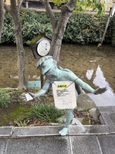 参拝の後、神社の裏手を流れる美しい川沿いを歩く。 そこには「河童伝説」が息づいていた。驚いたのは、伝説の主である河童までもが、現代的な「お知らせ」を首から下げて広報活動に励んでいたことだ。