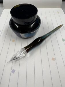 いよいよインク瓶の蓋を開ける。 ガラスのペン先がインクを吸い上げ、溝に色が満ちていく。この瞬間は、何度見ても飽きることがない。