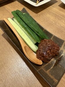 ヒートアップした議論の熱を冷ますように登場した、シャキッとした肉みそキュウリ。 ポリポリという軽快な音が響く中、私の頭の中では、話題たちが次々と手を挙げている状態だ。まぁ落ち着け。
